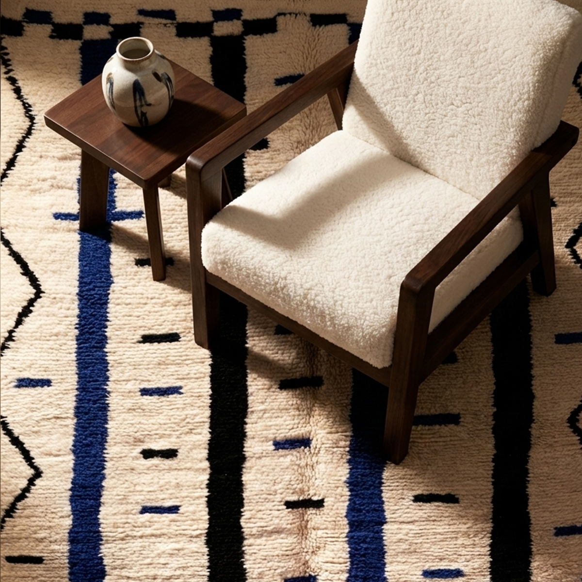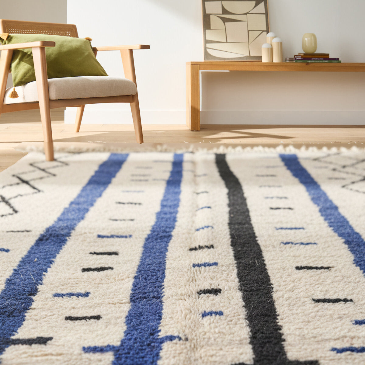 Handwoven in Morocco using 100% natural wool, each Zarbya rug is crafted on traditional looms by skilled artisans. Subtle variations in texture, tone, and weave are natural marks of its handmade character.